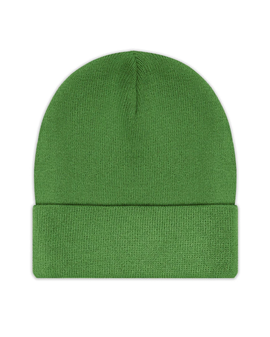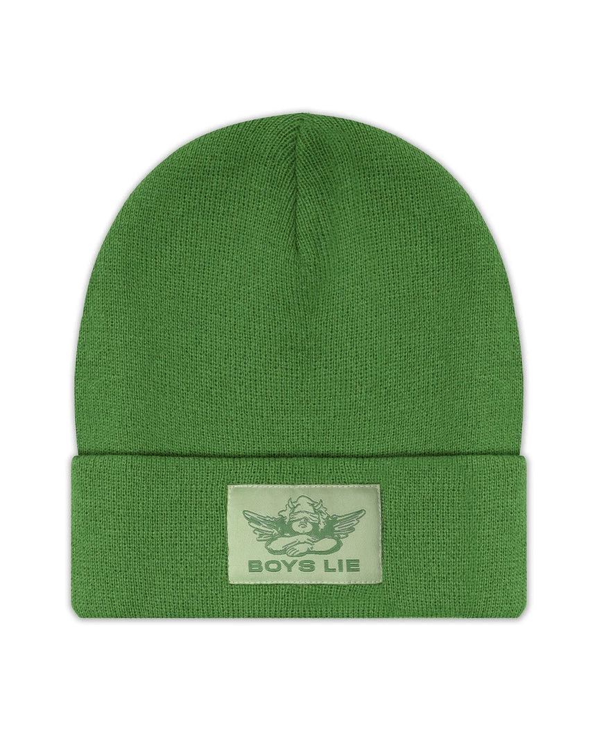 Olive green beanie with monochromatic olive Boys Lie logo patch.
