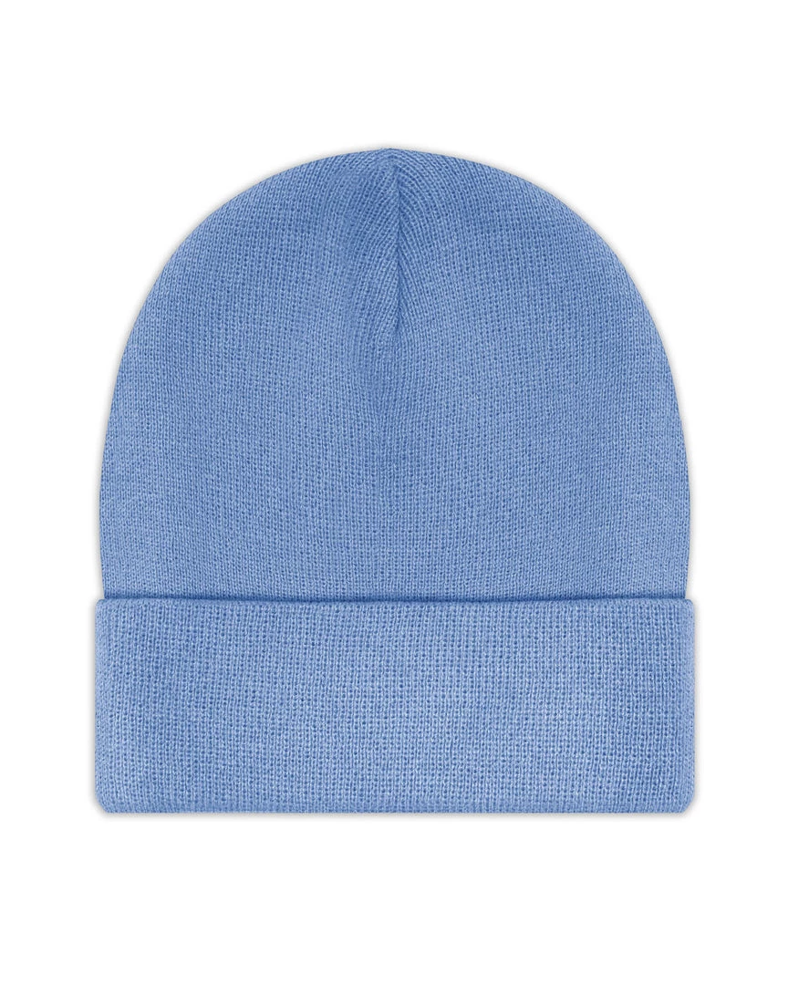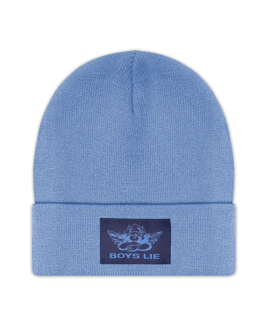 Blue beanie with monochromatic blue Boys Lie logo patch.
