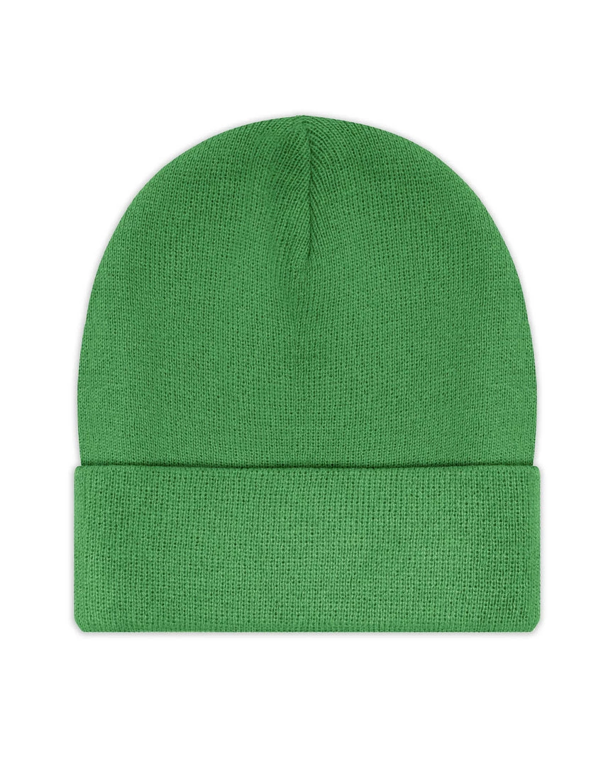 Green beanie with orange Boys Lie logo patch.