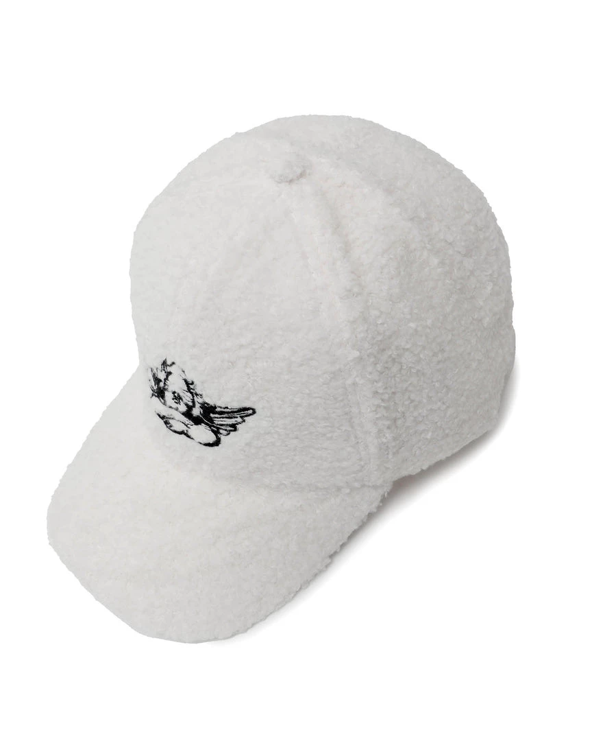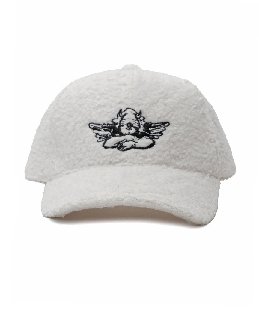 Faux cream sherpa baseball hat with black Boys Lie cherub logo and an adjustable velcro strap.
