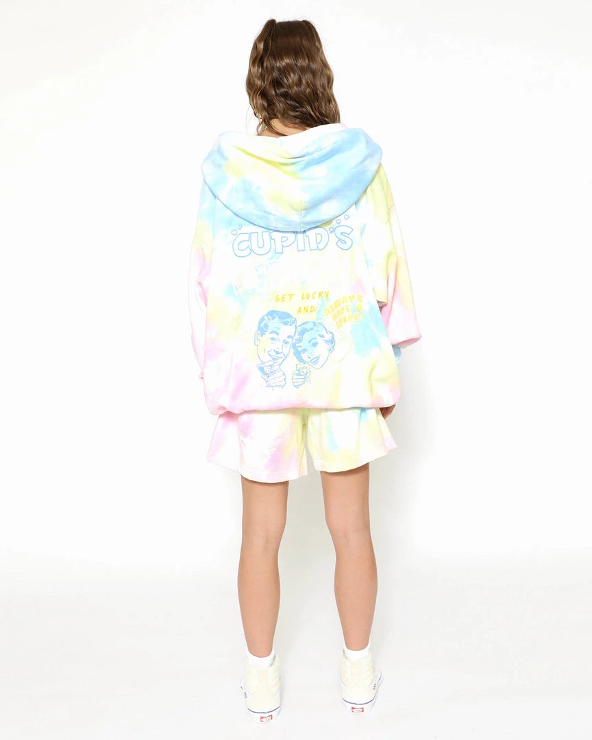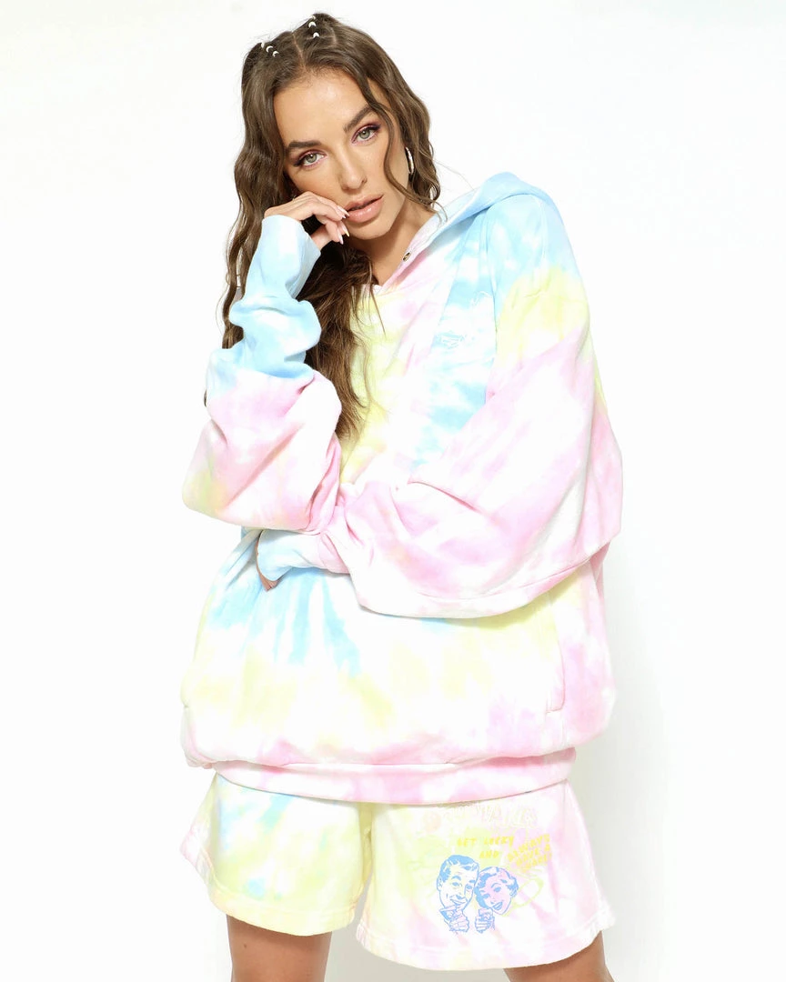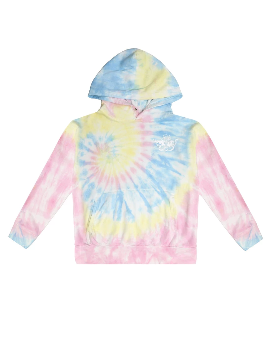 Lightweight fleece tie dye hoodie in pink, yellow, and blue. Oversized hood with snap closure and front pocket. Each item is hand dyed and may show slight color variations.