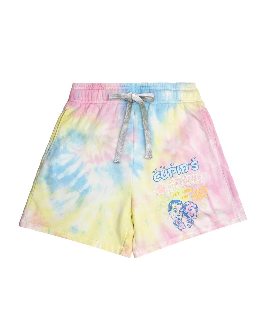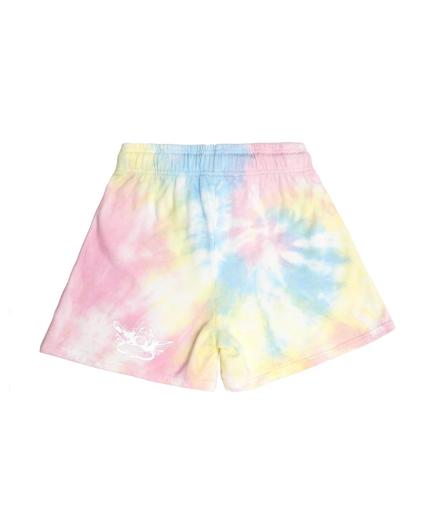 Lightweight fleece in pink, yellow, and blue tie dye. High rise sweat shorts with a thick elastic waistband, adjustable drawstring, and side pockets. Each item is hand dyed and may show slight color variations.