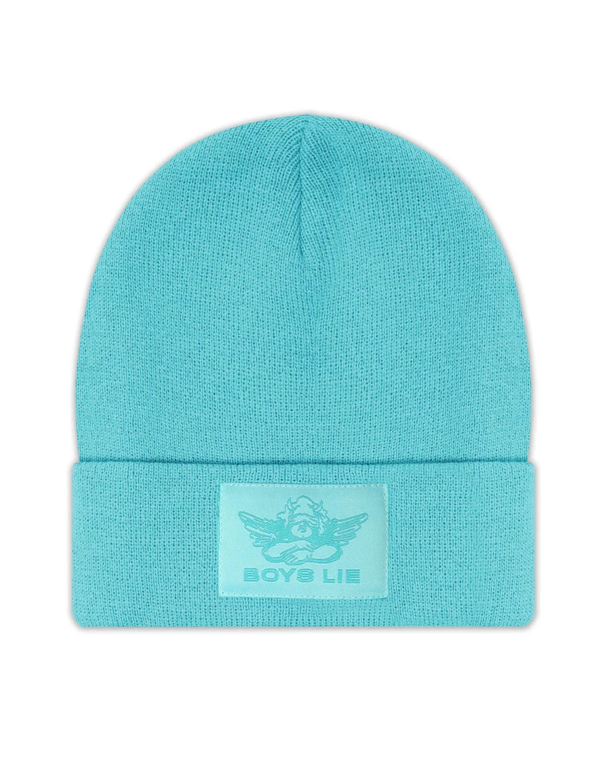 Aquamarine beanie with monochromatic Boys Lie logo patch.