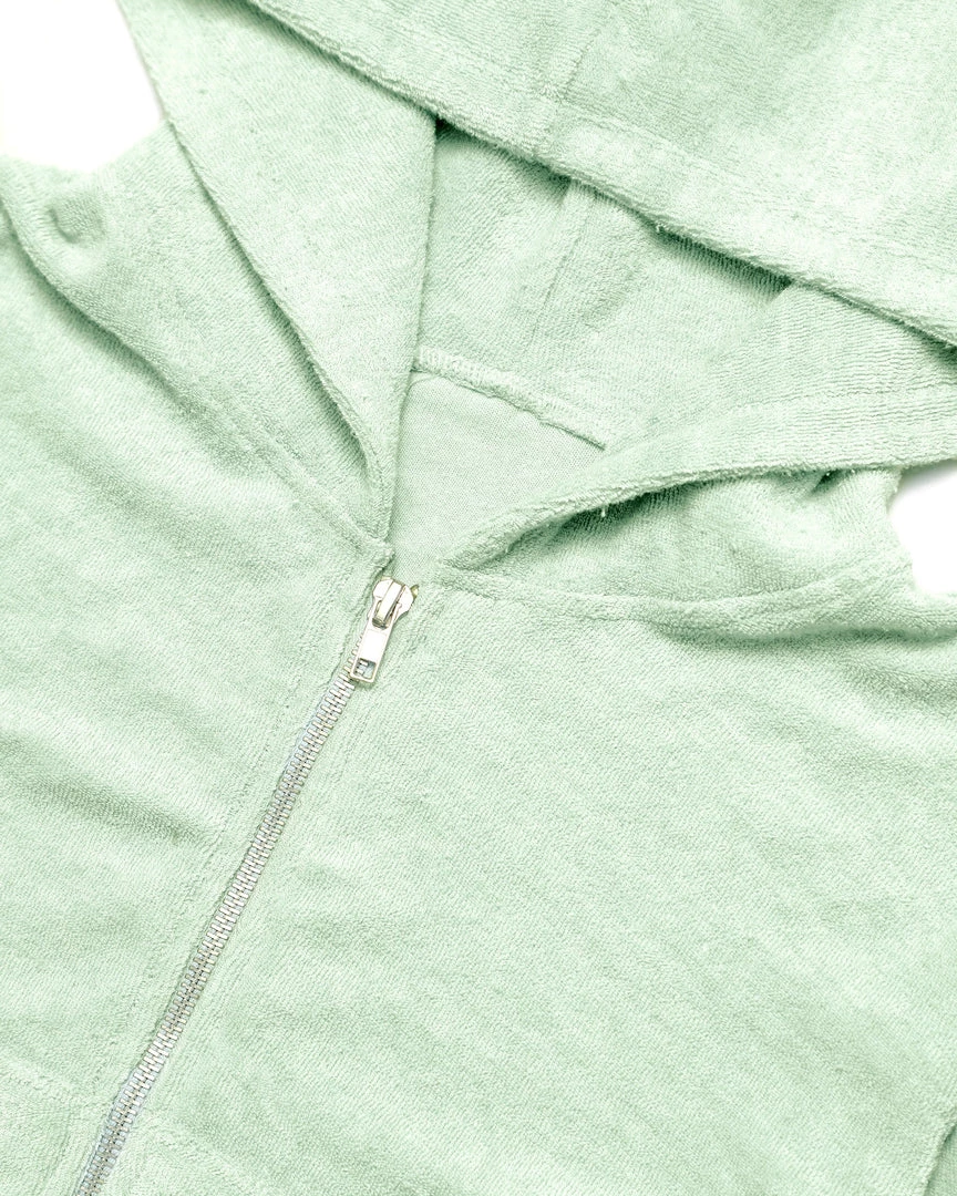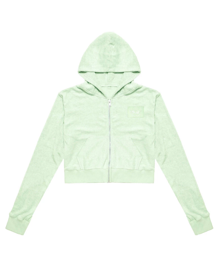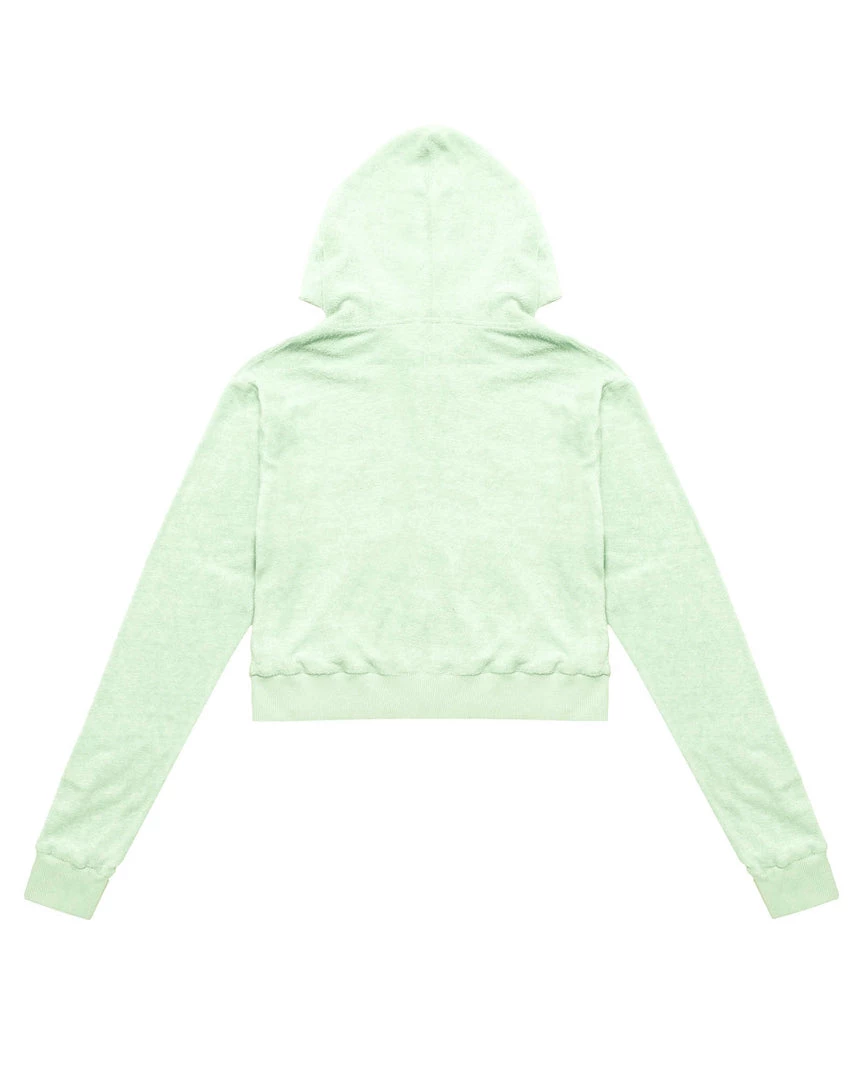 Lightweight terry cloth fabric in mint green. Zip up hoodie with cropped hem, front pockets, and Boys Lie logo patch. Washed for a vintage look and feel.