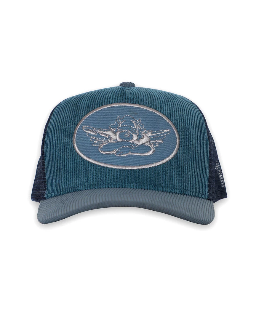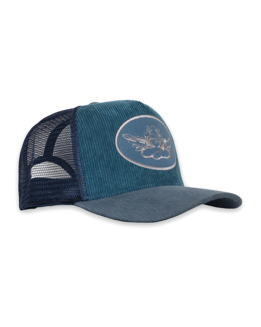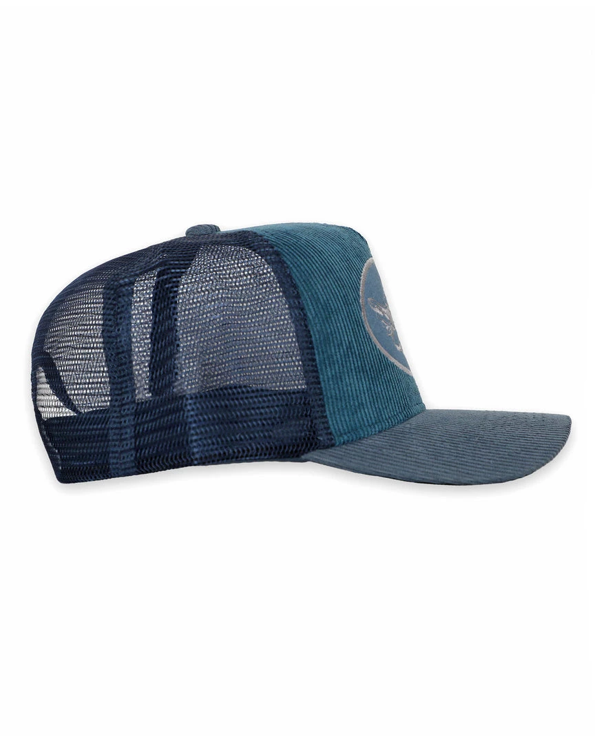 Navy trucker hat with blue patch and blue corduroy. Adjustable snapback.