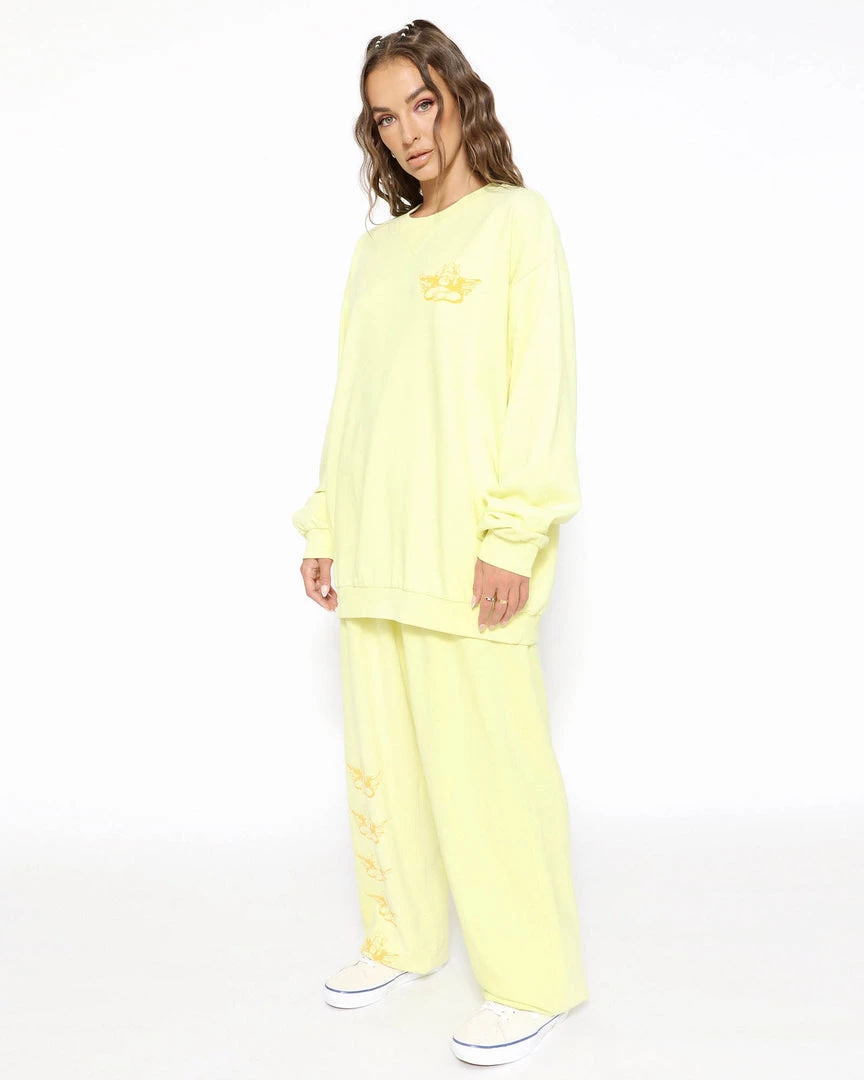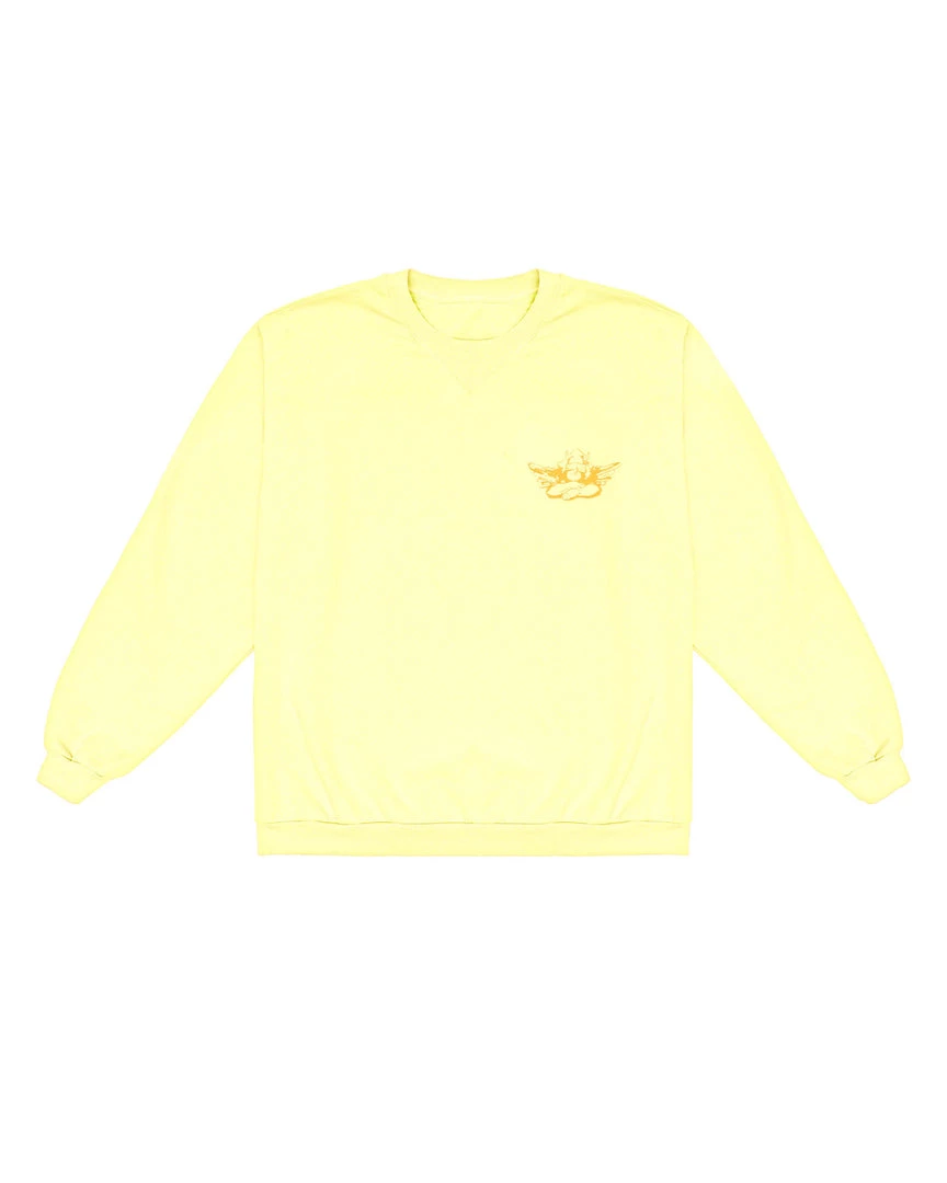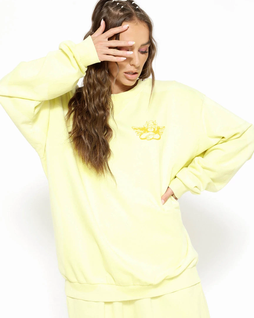 Lightweight cotton fleece oversized crewneck in light yellow. Ribbed cuffs, neckline, and V detail.