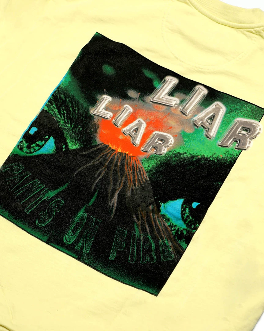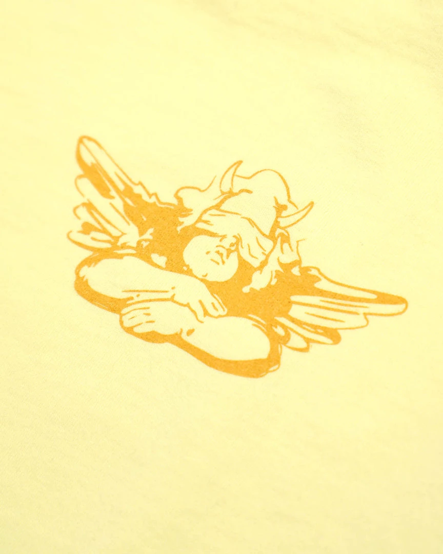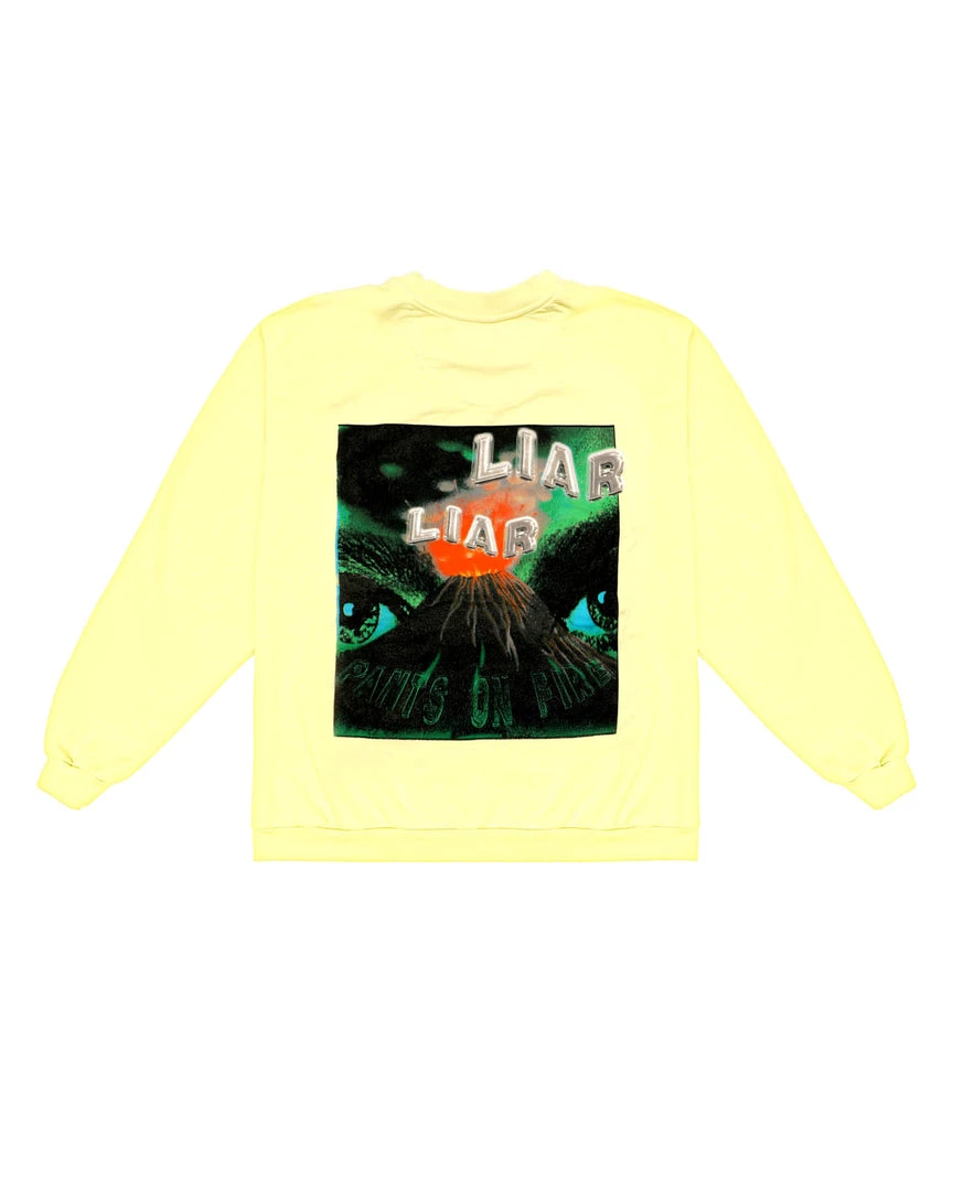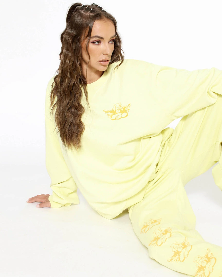 Lightweight cotton fleece oversized crewneck in light yellow. Ribbed cuffs, neckline, and V detail.