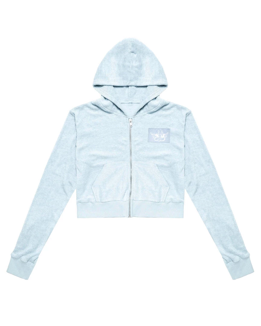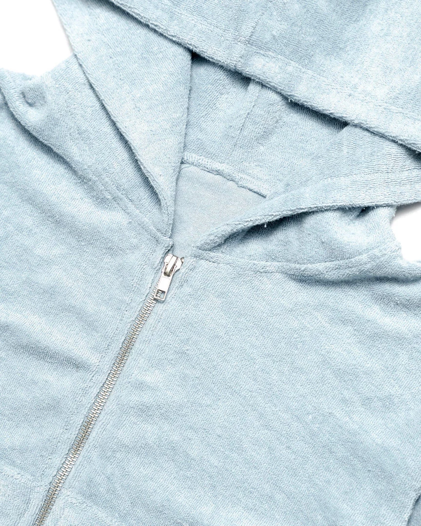 Lightweight terry cloth fabric in baby blue. Zip up hoodie with cropped hem, front pockets, and Boys Lie logo patch. Washed for a vintage look and feel.