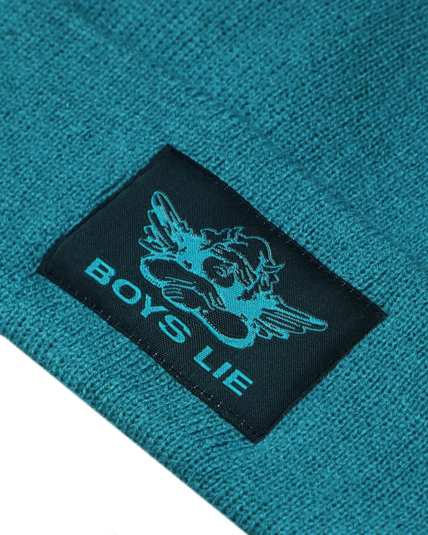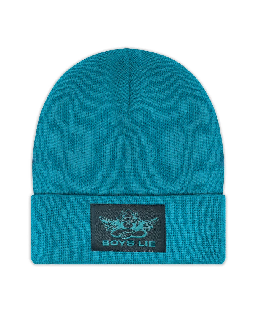 Teal beanie with monochromatic teal Boys Lie logo patch.