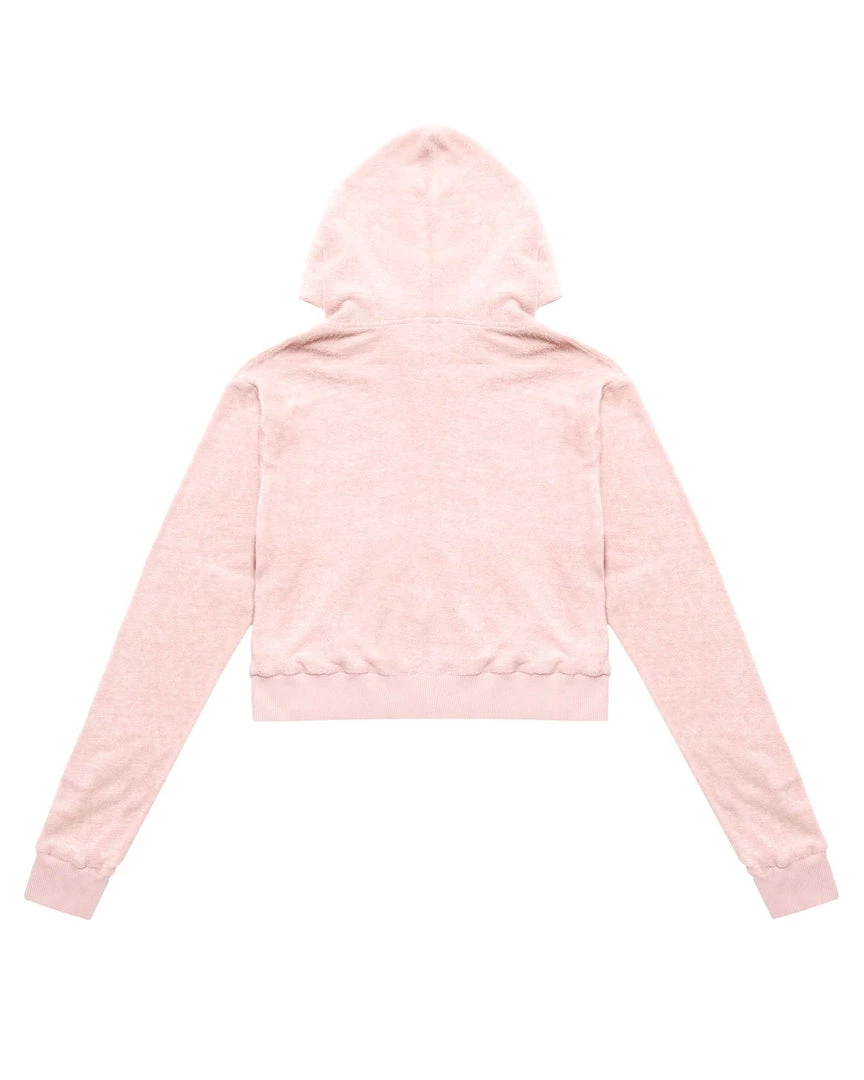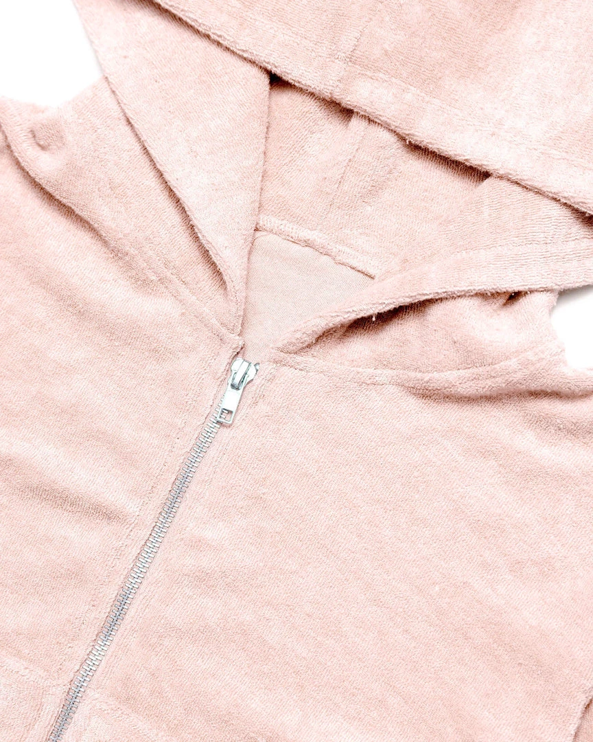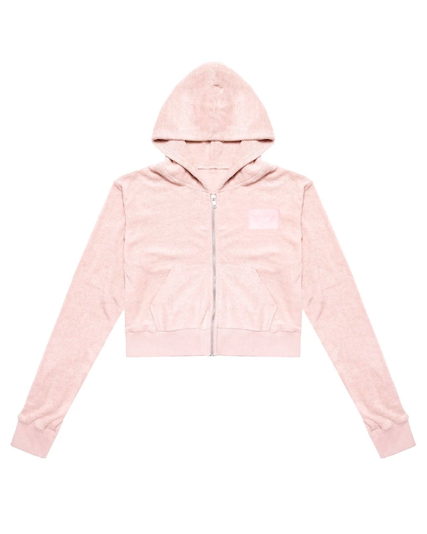 Lightweight terry cloth fabric in a soft pink. Zip up hoodie with cropped hem, front pockets, and Boys Lie logo patch. Washed for a vintage look and feel.