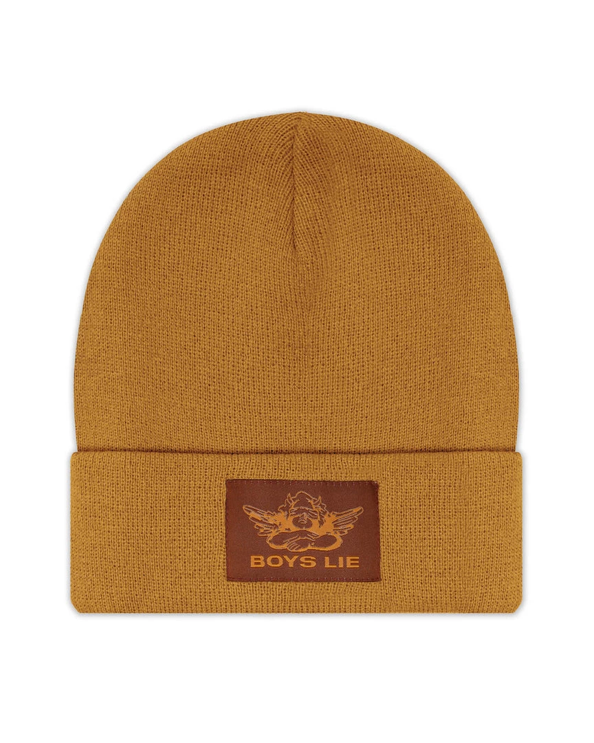 Dark gold beanie with monochromatic brown Boys Lie logo patch.