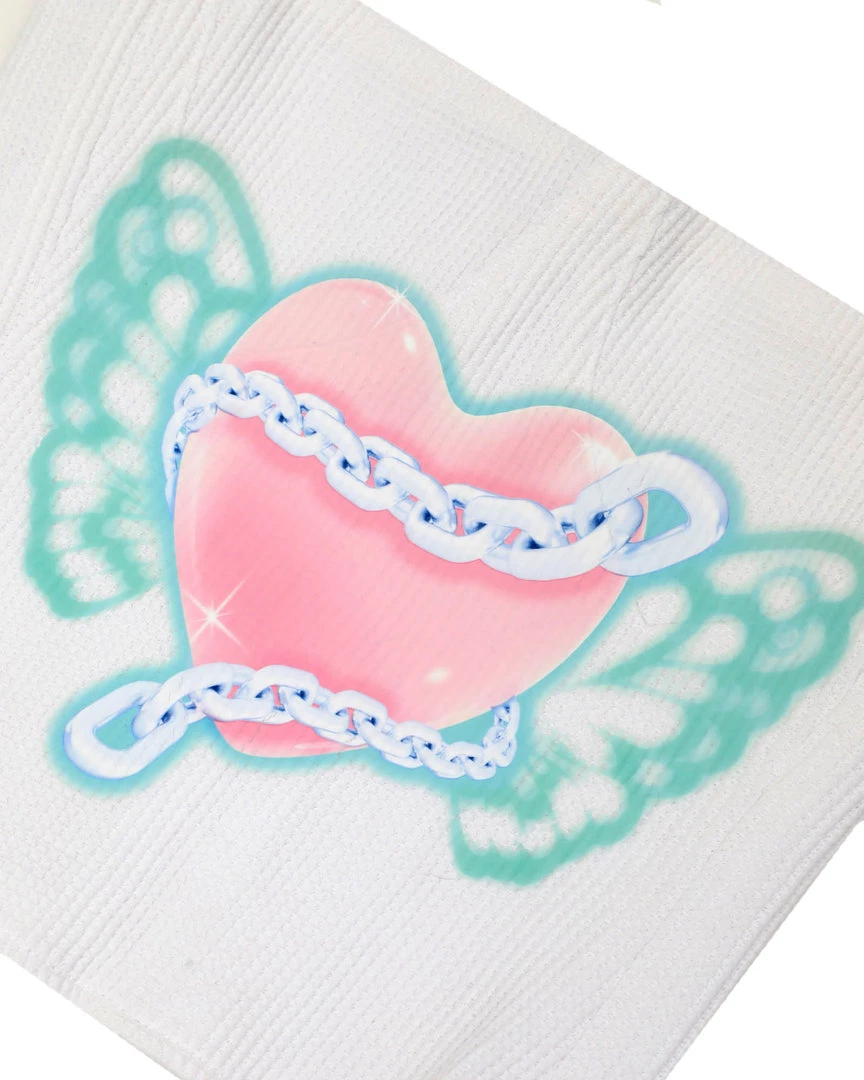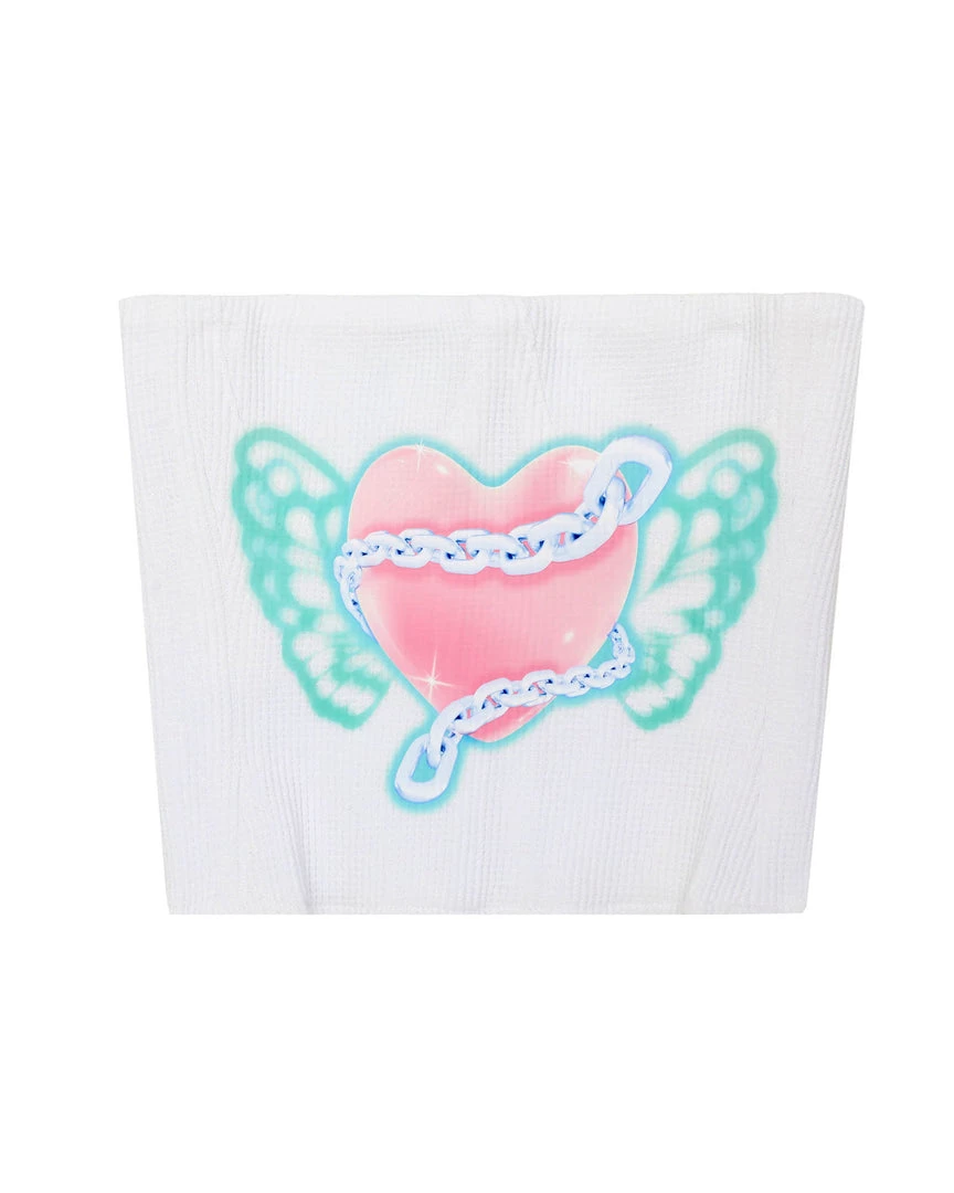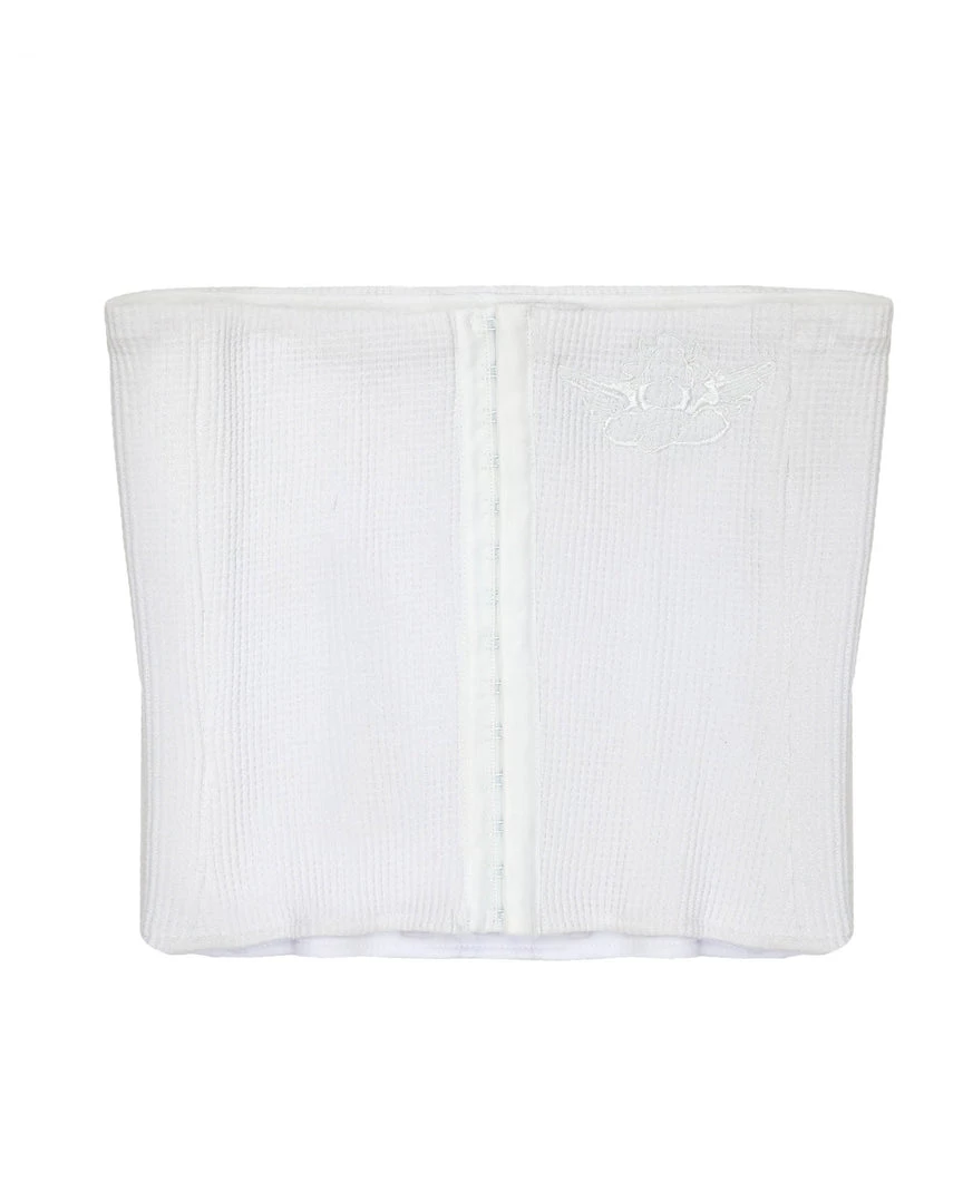 Soft thermal corset. Metal boning, seam details, hook and eye back closures. Front graphic.