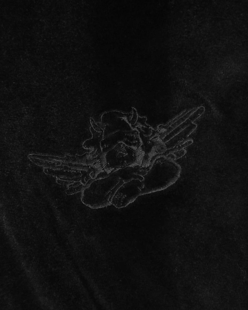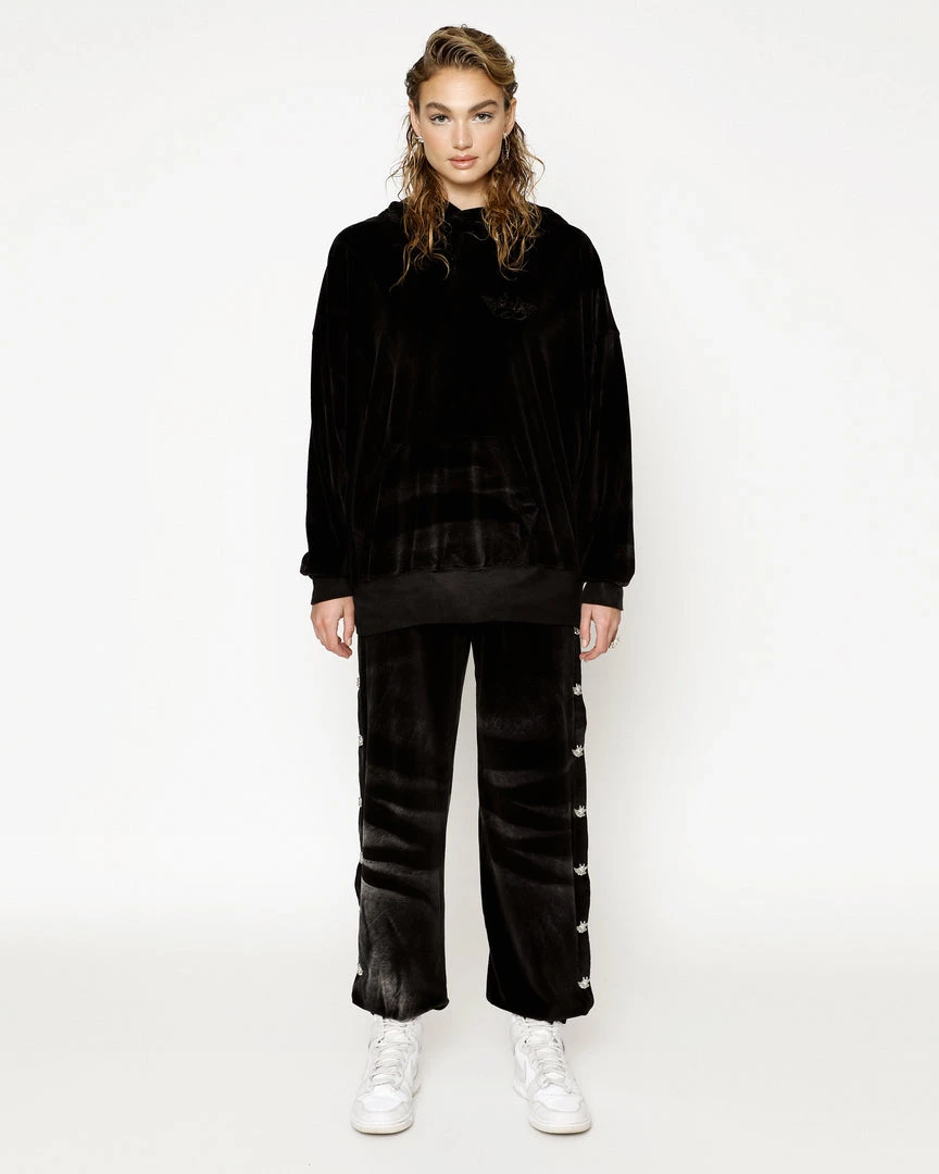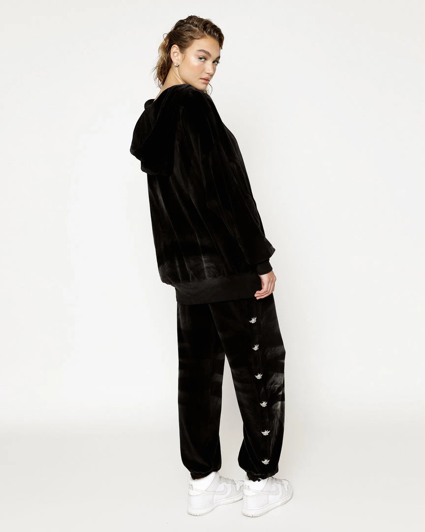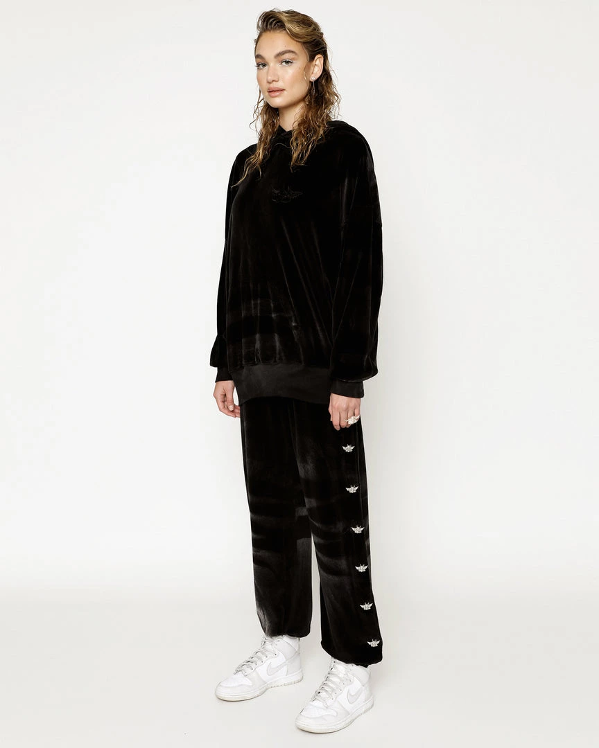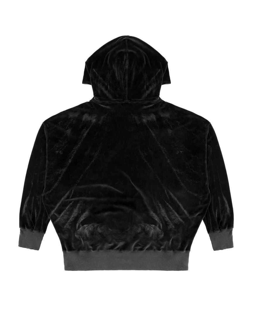 Oversized velour hoodie with front pocket, embroidered front chest logo, ribbed cuffs and hemline. Each item is hand dyed – may show slight color variations. Made in Los Angeles, California.