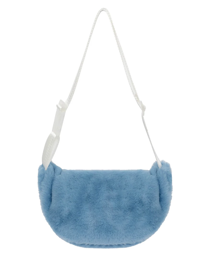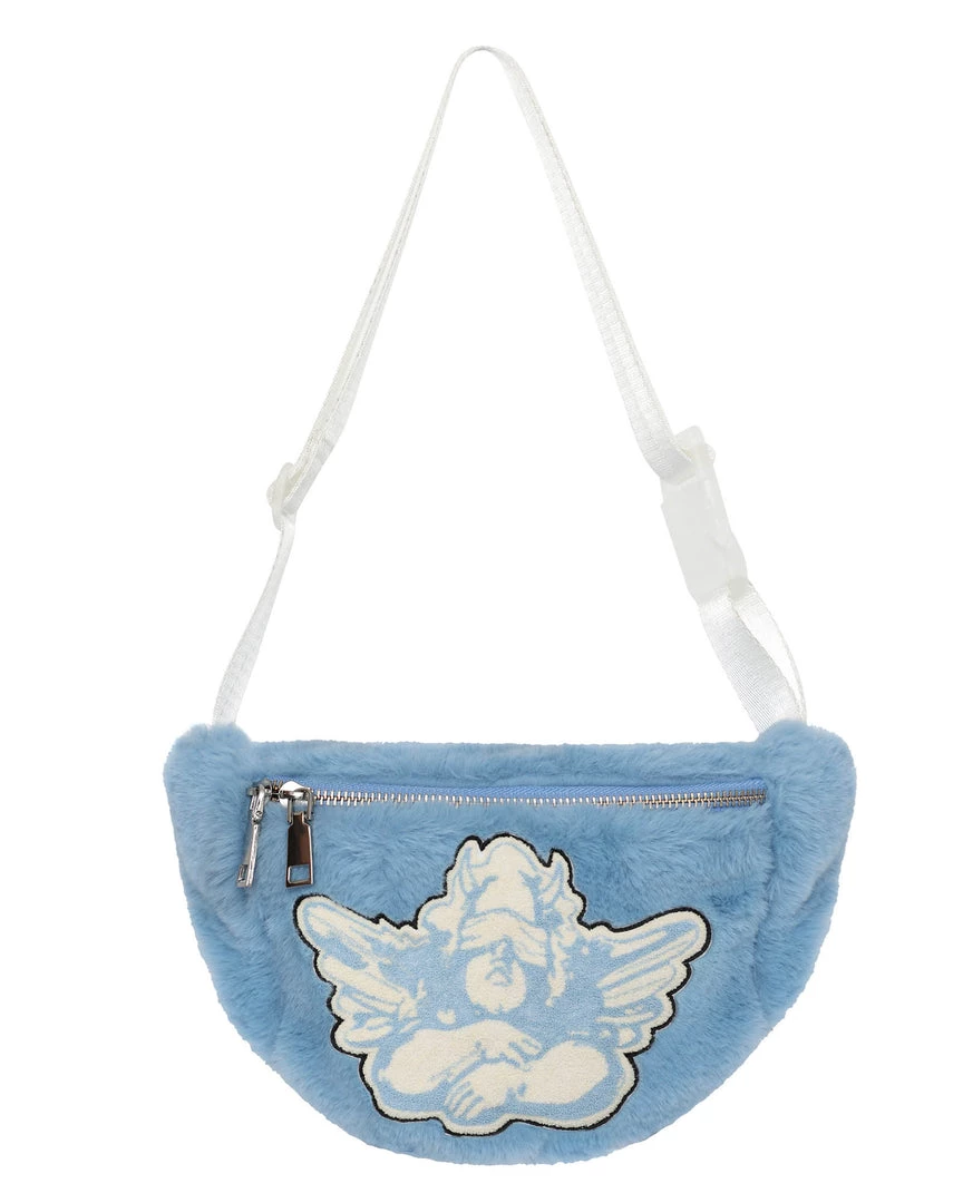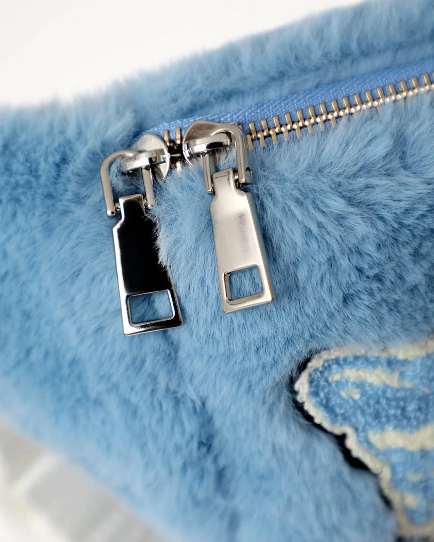 Faux fur fanny pack bag. Adjustable strap with buckle closure. Chenille patch logo.